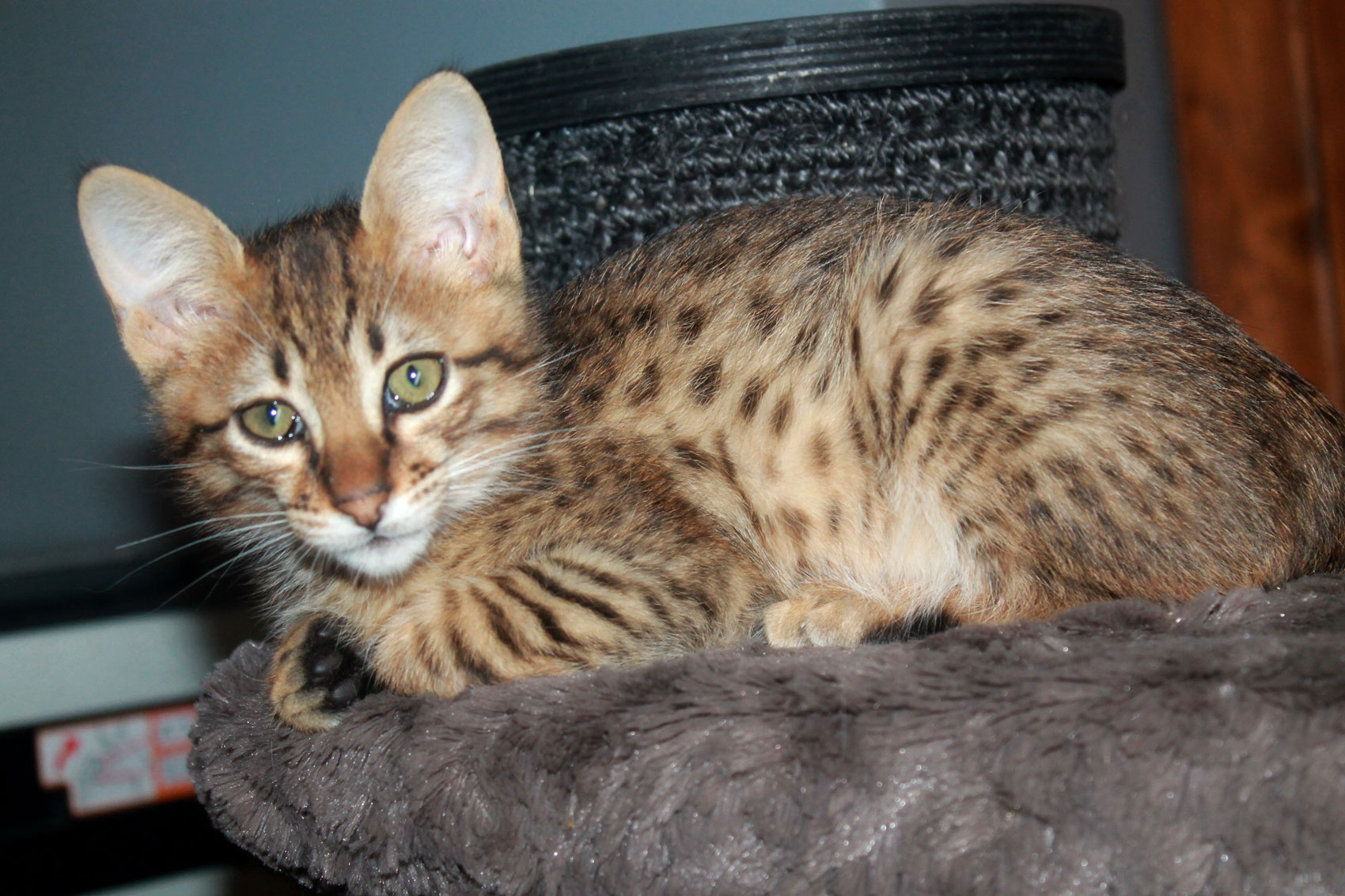 Notre dernier chaton Savannah né le 14 mars dernier est désormais près pour l’adoption. C’est un Savannah de génération F6 haut sur pattes et d’une très grande lignée.